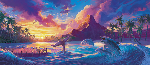 A dramatic fantasy piece featuring orcas leaping out of a volcano. Personal work.